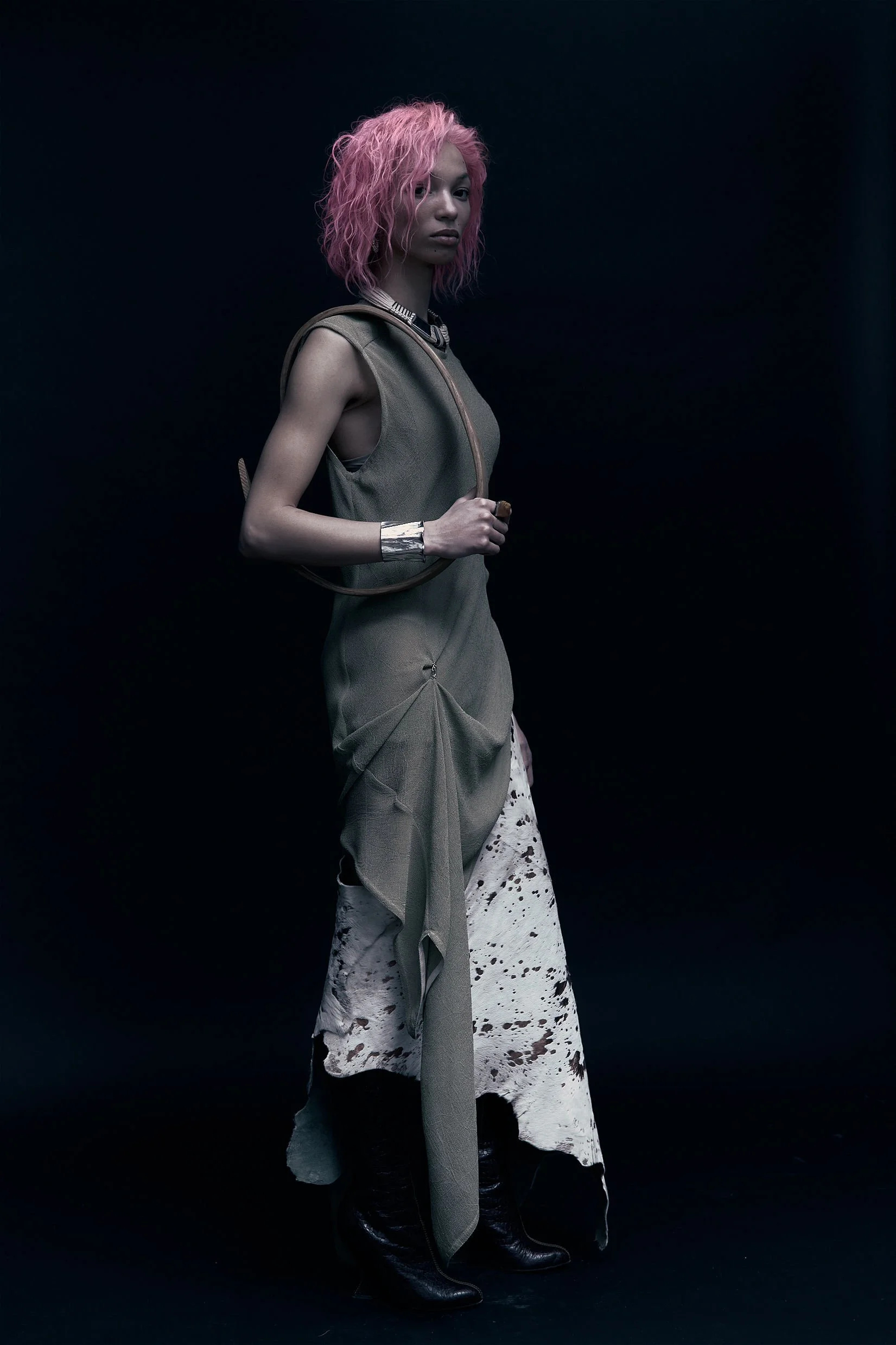 As a queer, non-gender conforming artist, their work challenges the binary structures within fashion and art. Their aim is to inspire others to move beyond rigid gender norms and to embrace the fluidity of identity—there are no definitions or limits to being, and no boxes to fit into.